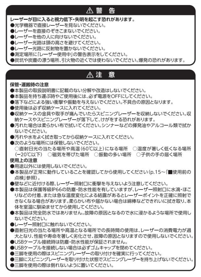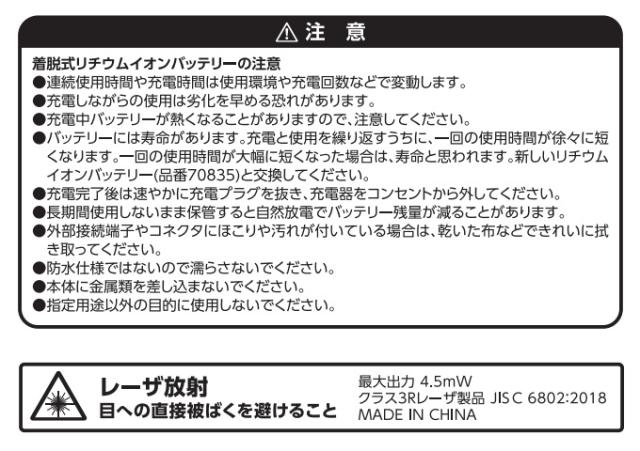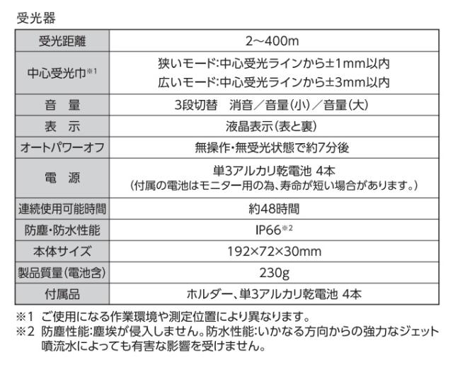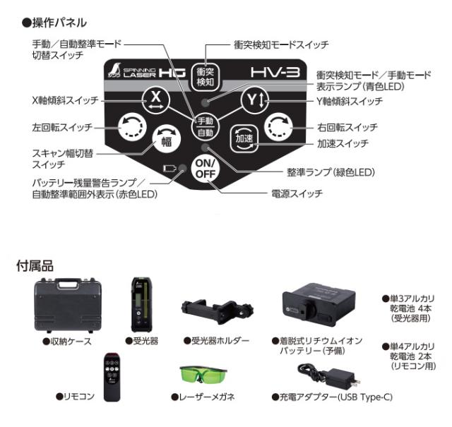 ●収納ケース ●受光器 ●単3アルカリ乾電池 4本(受光器用)●受光器ホルダー ●レーザーメガネ ●充電アダプター(USB Type-C) ●着脱式リチウムイオンバッテリー(予備)●リモコン ●単4アルカリ乾電池 2本(リモコン用) |