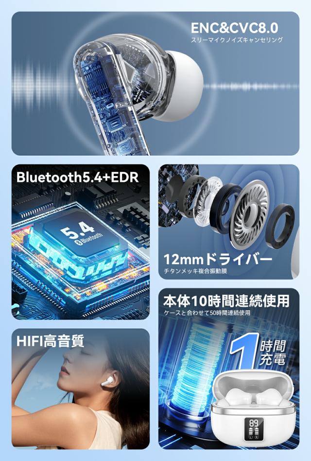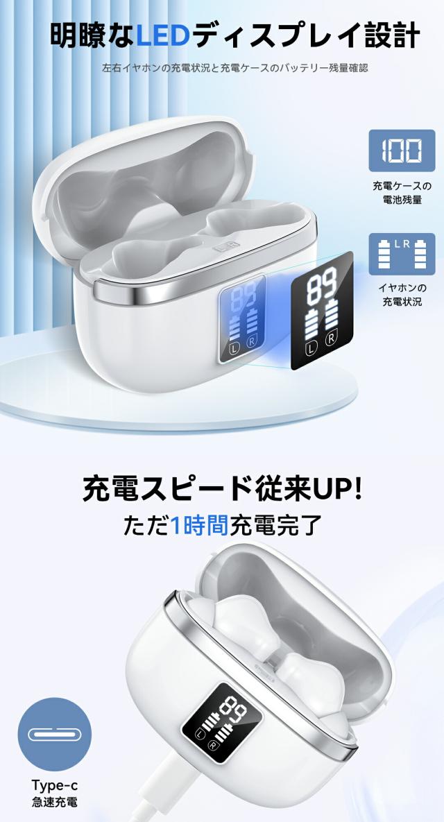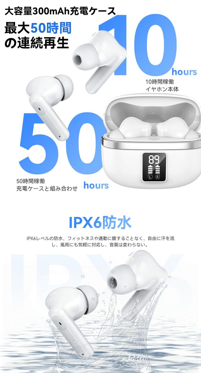 「2025最新音質重視進化版」ワイヤレスイヤホン bluetooth bluetooth5.4搭載 ENC通話ノイズキャンセリング 残量表示 Type‐C充電 HIFI高音質 IPX6防水 50時間連続稼働 iPhone/Android