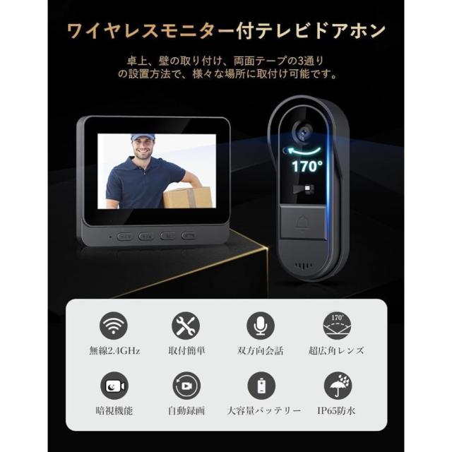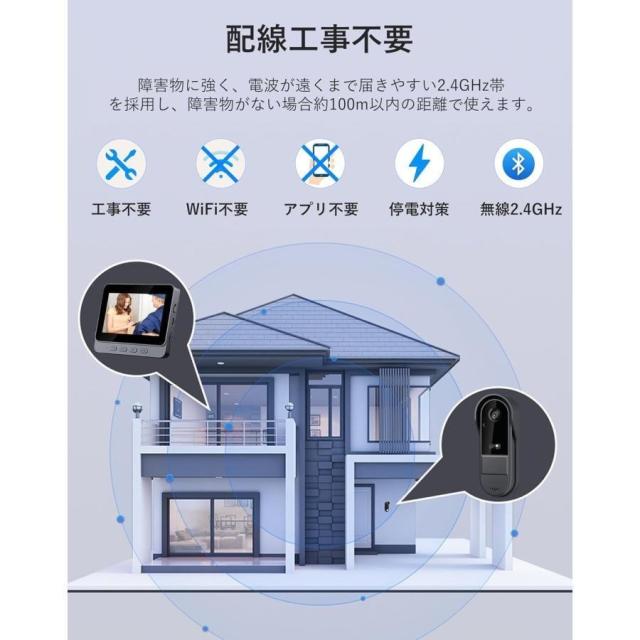 インターホン カメラ付き ワイヤレス 工事不要 モニター付き テレビドアホン 双方向通話 録画 暗視ドアホン USB充電 玄関 防犯 介護 チャイム インターホン ドアホン