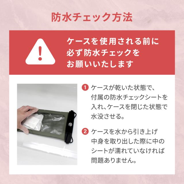 ※本製品は簡易防水を目的に作られております。防水チェック前の水中での使用、水上および水中スポーツでの使用は絶対におやめください。