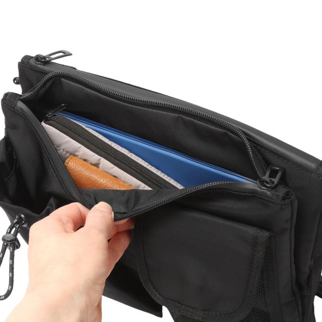 フロントサイド片側にはキーフック付きのポケットを配置。