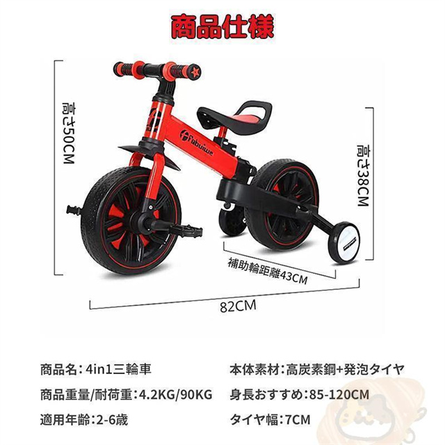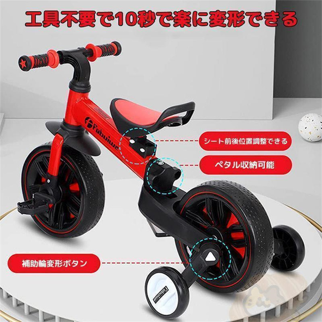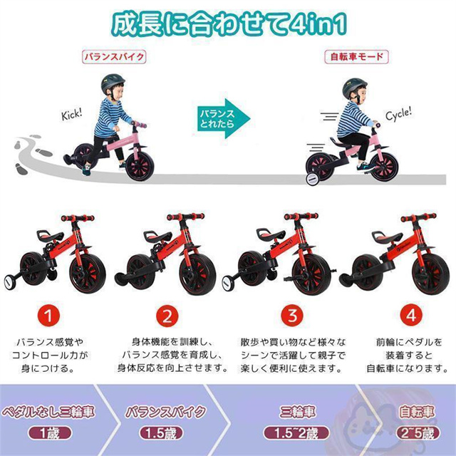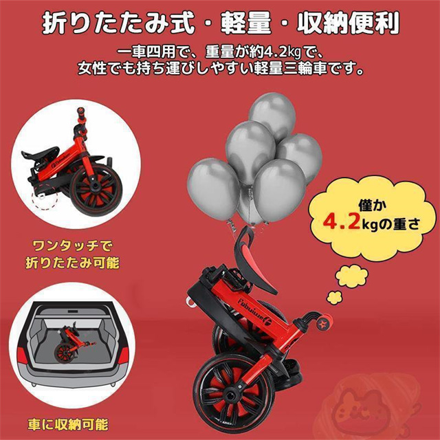 【多機能一台四役】三輪車、ペダルのない足けりモード、二輪のバランスモードバイクとバランス感覚を養う自転車また子供自転車を工具なし簡単に自由に切り替えます。赤ちゃん用バイクで一台でオッケーです。一車四用で、重量が約4.2kgで、女性でも持ち運びしやすい軽量三輪車です。工具なしで簡単に変身できる子供自転車です。