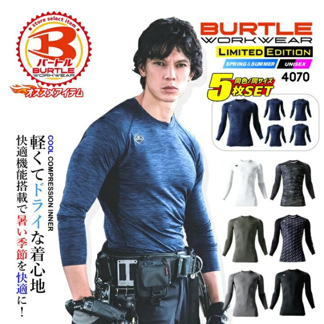 【即日発送】バートル 2025年SS新作 インナーシャツ 夏用 (5枚組)吸汗速乾 消臭 メッシュ UVカット アンダーシャツ 4070【同色・同サイズ 5枚組】コンプレッション ストレッチ 男女兼用 スポーツ 作業服 作業着 BURTLE