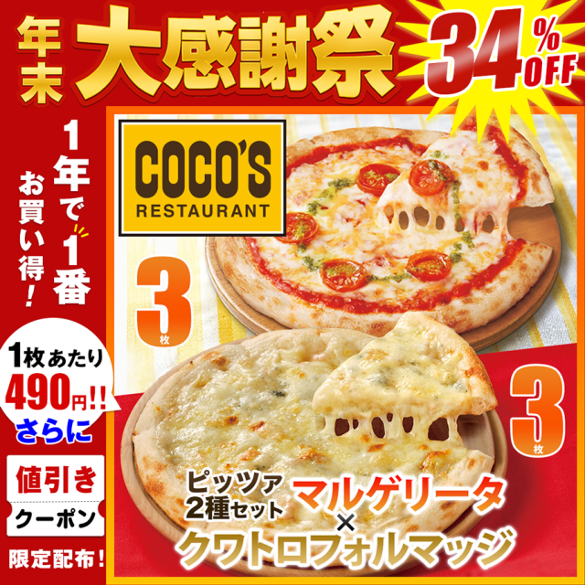 | アレルゲン | 『ココス マルゲリータ』・・・小麦・乳成分・りんご 『ココス クワトロフォルマッジ』・・・小麦・乳成分・大豆・鶏肉 |