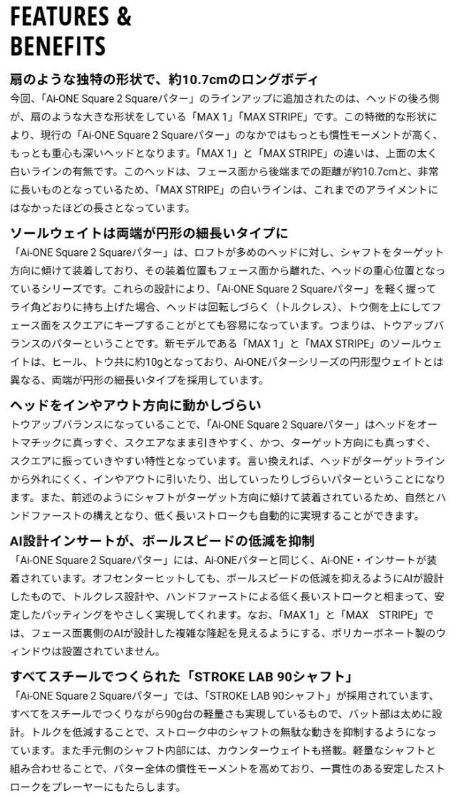 オートマチック感もMAXに 真っすぐなストロークのしやすさで、昨年の発売以来、高い人気となっている「Ai-ONE Square 2 Squareパター」に新モデルが加わりました。 |
