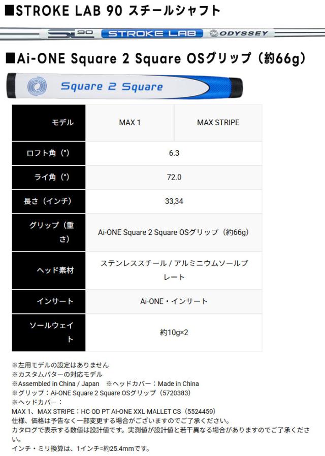 オデッセイ Ai-ONE Square 2 Square MAX 1/MAX STRIPE パター STROKE LAB 90シャフト装着 2025年モデル[ODYSSEY スクエア 2 スクエアマックス][日本仕様 日本正規品]