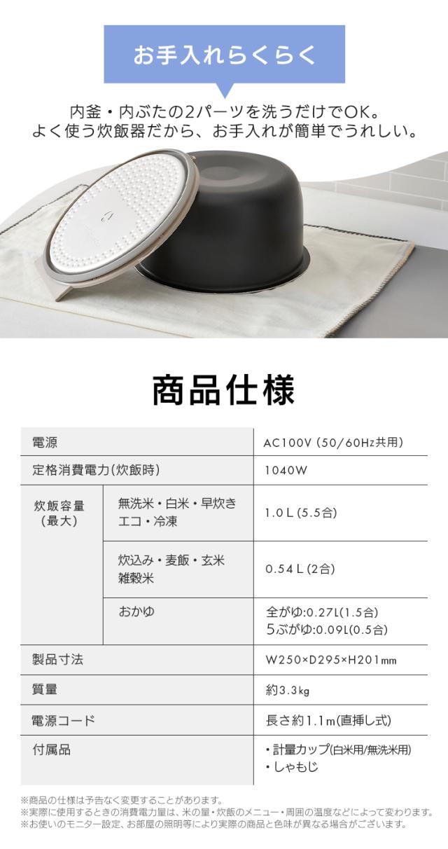 - 注文して2日で届きました。 今までの 炊飯器と違い カラーとデザインが気に入りました。また サイズもコンパクトになり 手入れも簡単でうれしい限りです。ありがとうございました。