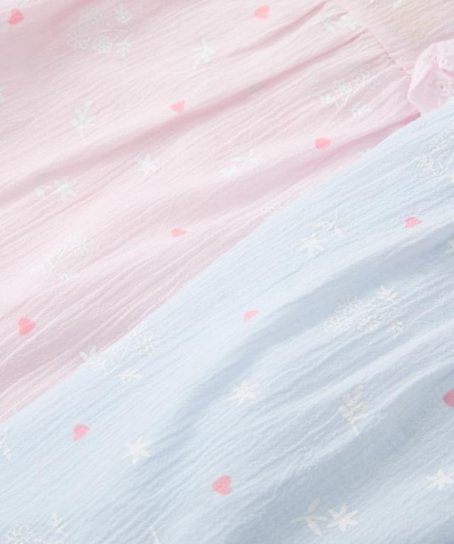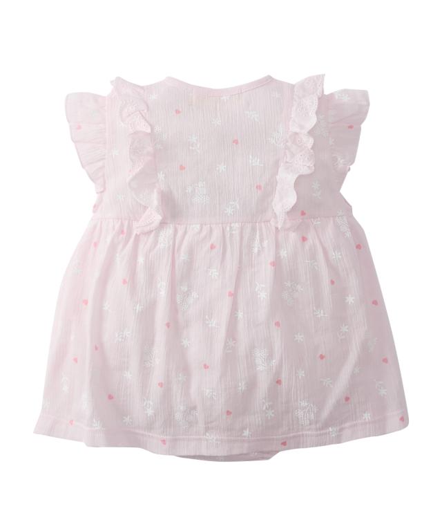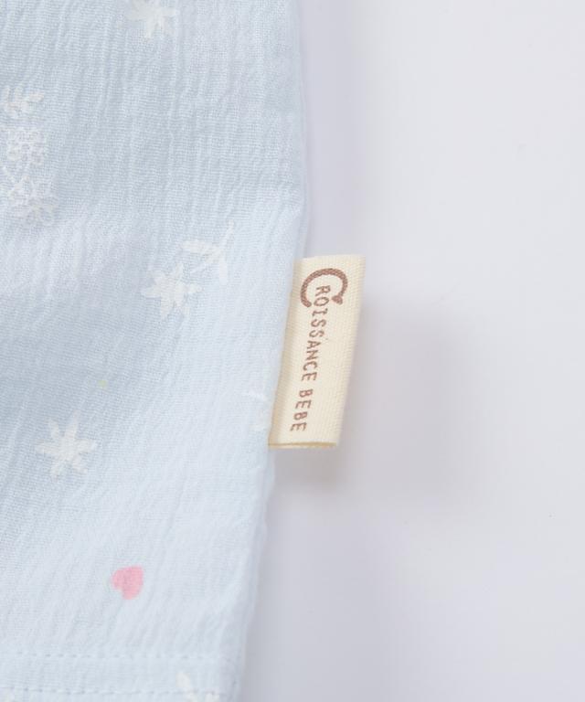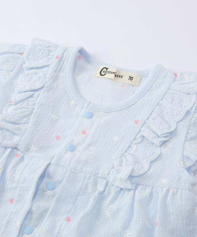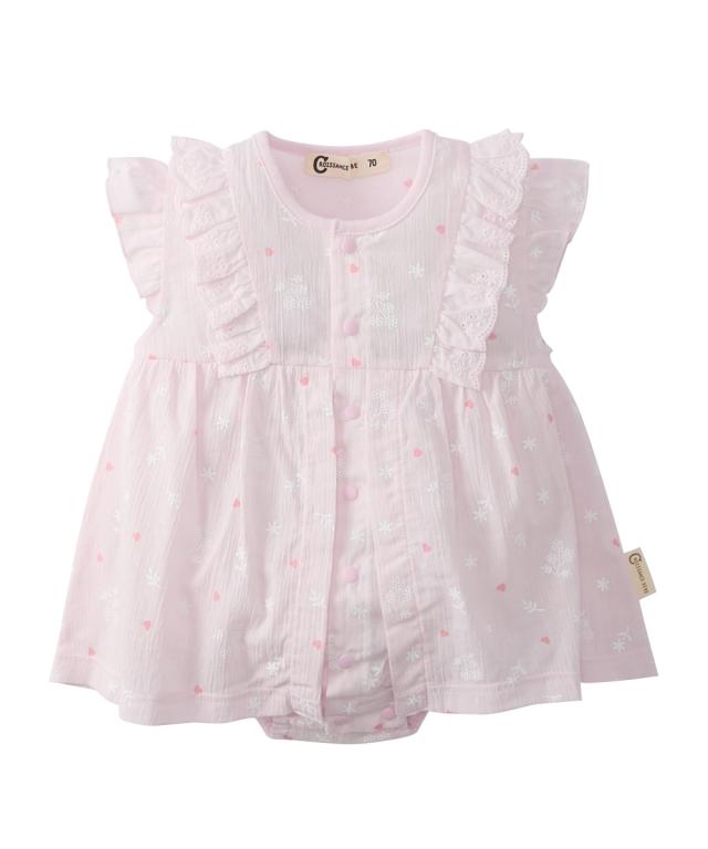 夏のお出かけにぴったり!涼しげなクレープ素材のカバーオールです。 ■design ・ハートやお花の模様がちりばめられた総柄デザイン ・胸元のレースとフリル袖が上品で華やか ・ワンピースのようなふんわりとしたAラインシルエットで女の子らしさを演出 ■point ・寝たままでもお着替えやおむつ替えがしやすい、前開き&股下ボタン開き仕様。 ・綿100%で肌にやさしく、通気性の良いクレープ素材で汗をかいても快適に過ごせます。