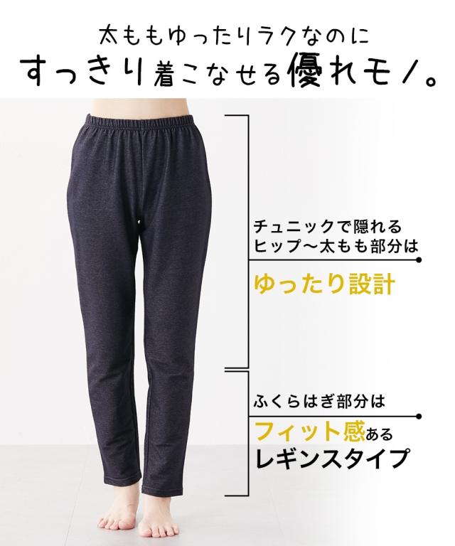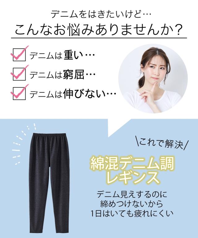太ももゆったり綿混デニム調10分丈レギンス 太ももゆったりラクなのに すっきり着こなせる優れモノ! ●チュニックで隠れるヒップ〜太もも部分は『ゆったり設計』 ●ふくらはぎ部分は『フィット感のあるレギンスタイプ』 デニムをはきたいけど… こんなお悩みありません 『デニムは重い…』 『デニムは窮屈…』 『デニムは伸びない…』 \綿混デニム調レギンスで解決/ デニム見えするのに締め付けないから1日中はいても疲れにくい! 【デニム見えでも…】 ・デニム見えでもやわらかい 綿混素材で肌あたりがソフト、はき心地らくちん ・デニム見えでものびーる 動きやすいタテヨコストレッチ素材ではき心地らくちん ・デニム見えでもウエストゴム ウエストはぐるり1周ゴムでらくちん ゴムがねじれにくい縫製ではきごこち快適 ・デニム見えでも股上深い 股上深めなので、しゃがんでも背中が出にくい ◆◇POINT◆◇ 〇はきこみ丈深めでかがんでも背中が見えにくい 〇締め付けないフィット感 〇足首までカバーする10分丈 『きっと見つかる自分サイズ』 どんな体型の方にもご満足いただけるようサイズを多数揃えました M〜Lから10Lサイズまで豊富な7サイズ展開