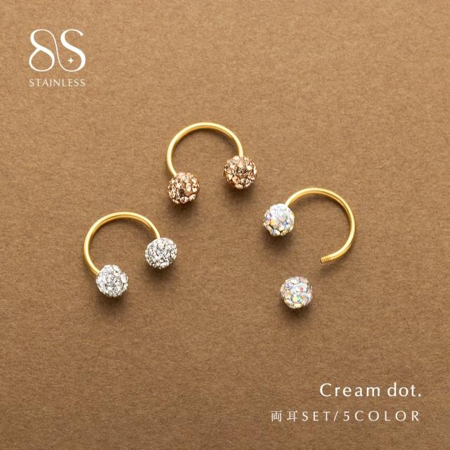 パヴェボールが品良く煌めくネジロック式ピアス。ポストが湾曲したサーキュラー型で、縦向きにして耳裏から覗かせたり横向きに着用したりとお洒落の幅が広がるアイテムです。前後を気にせず使えるデザインと低アレルギー素材のステンレス製で長時間の着用にもオススメ。