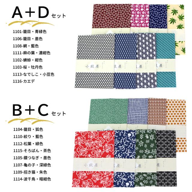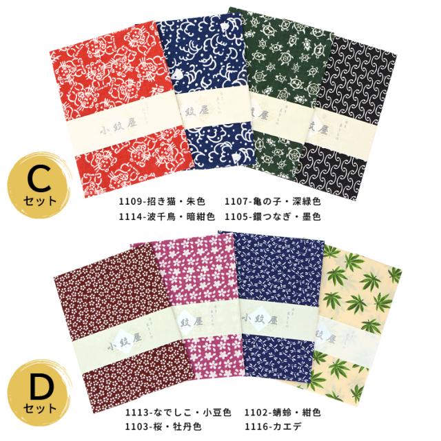 Cセット:1105-鐶つなぎ・墨色、1107-亀の子・深緑色、1109-招き猫・朱色、1114-波千鳥・暗紺色