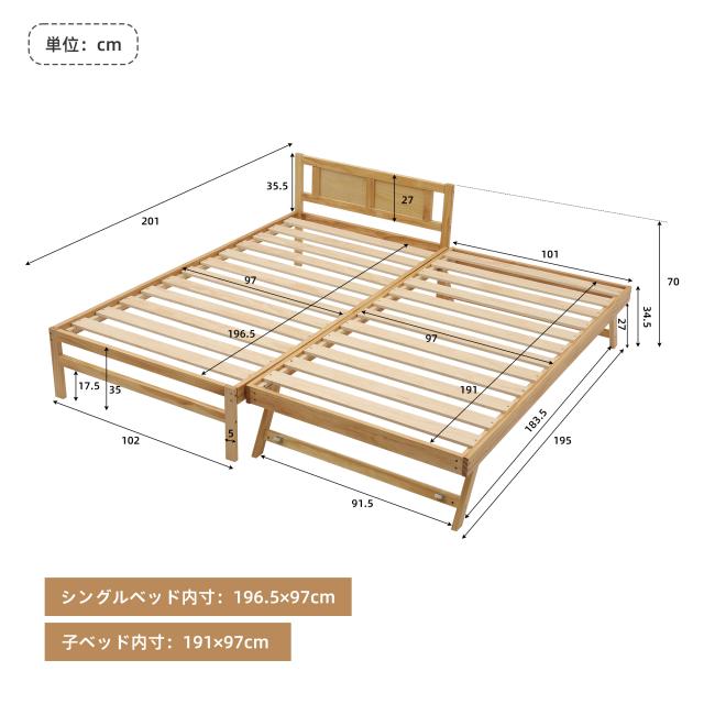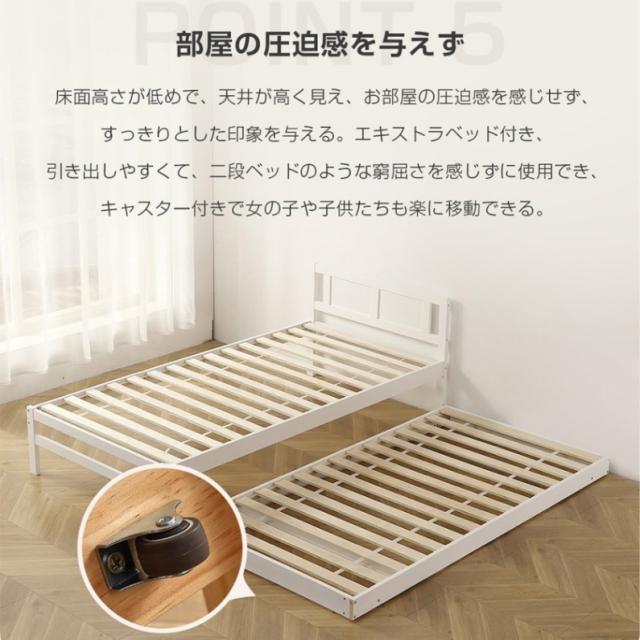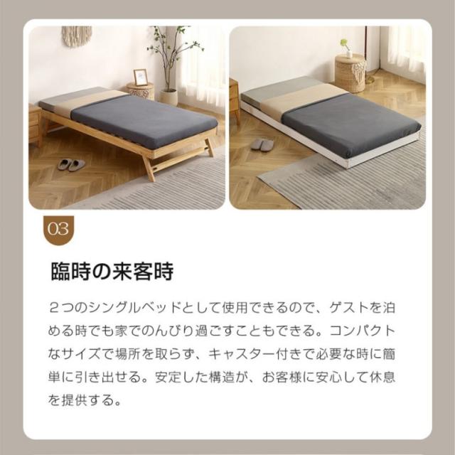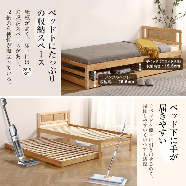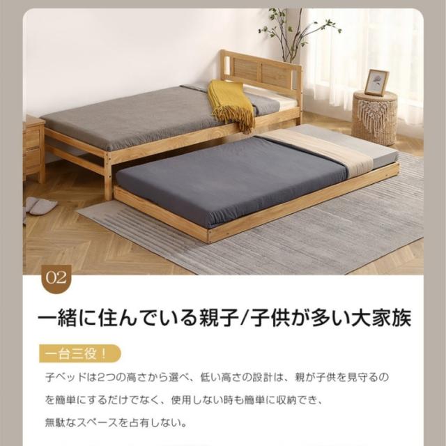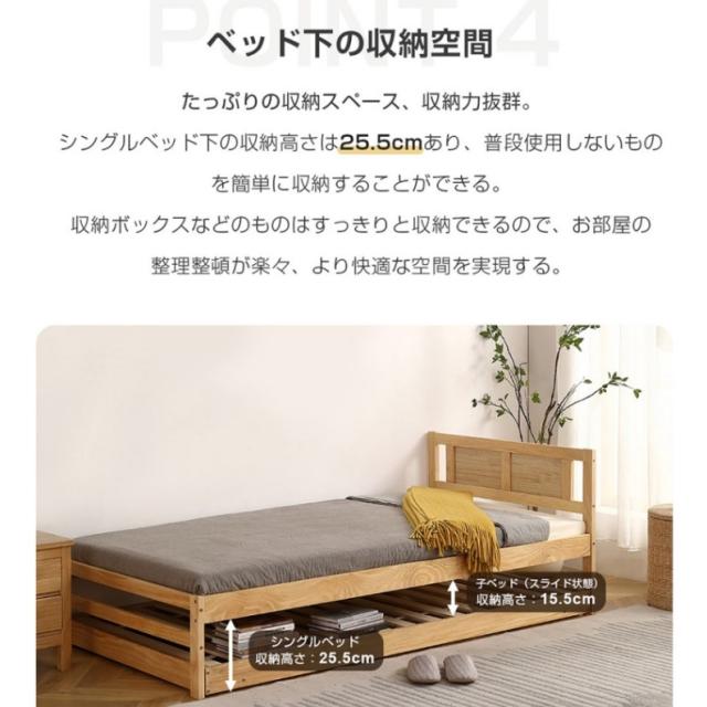 【多機能・子ベッド】 移動子ベッドはキャスター付きで自由な移動が可能。シングルベッド下への収納もでき、収納ボックスなども設置可能。雑多な物品を持つ家庭にも適しており、この一台で整頓された空間を実現。スペース管理の解決策としておすすめ。