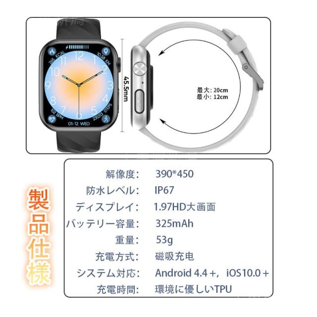 1.97インチフルタッチスクリーンは、より高精度な大画面で通知や文字を表示されます。350mAhの大容量バッテリーが搭載、一回のフル充電で5-7日間長持ち可能です。頻繁に充電する邪魔はありません。