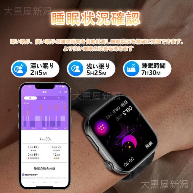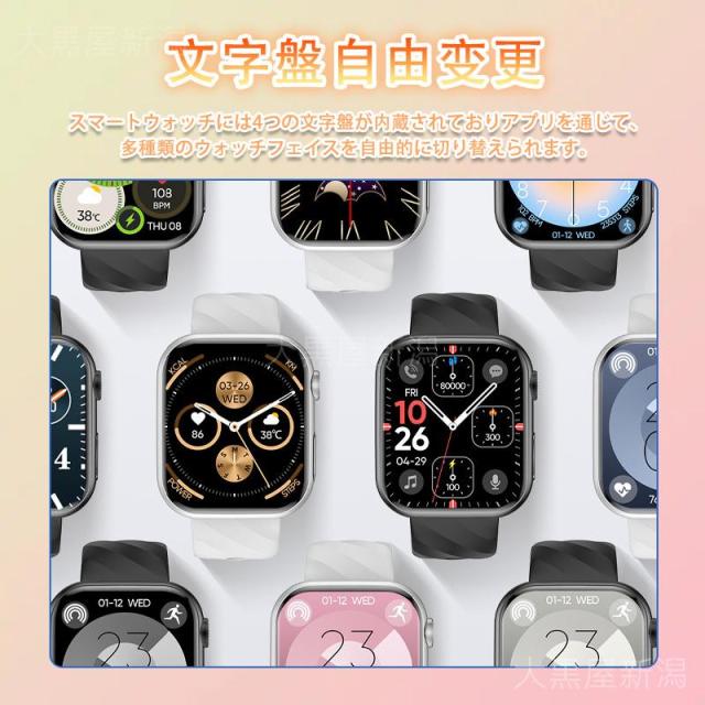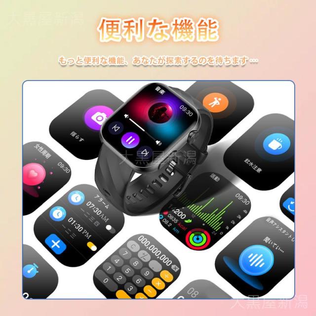 スマートウォッチ iPhone対応 アンドロイド対応。天気予報、ストップウォッチ、遠隔カメラ、アラム、呼吸訓練、女性の生理周期管理、など実用な機能が備えて、日常生活をサポートします。生活防水で汗、雨、水しぶきにも大丈夫。日常生活の手洗いや洗顔の際にも取り外す必要ありません。完全防水ではありませんので、水泳・温泉・入浴などの場合はご遠慮ください。