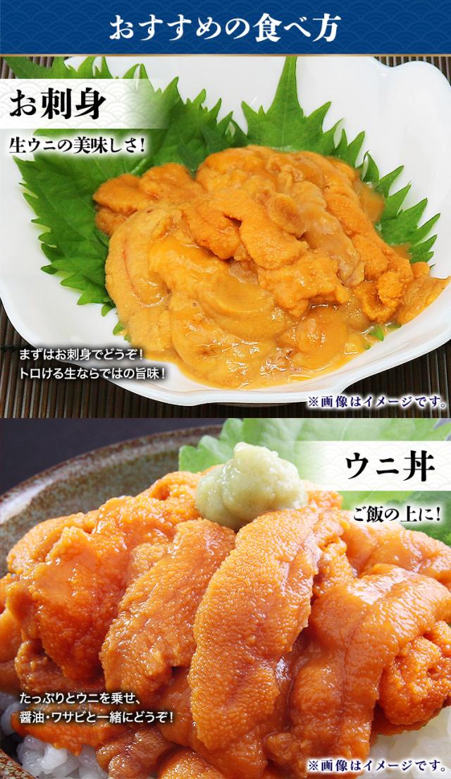 100gでうに丼(普通盛で)約2杯分♪ご飯の上にたっぷりとウニを乗せ、醤油をかけて食べるのもおすすめ!