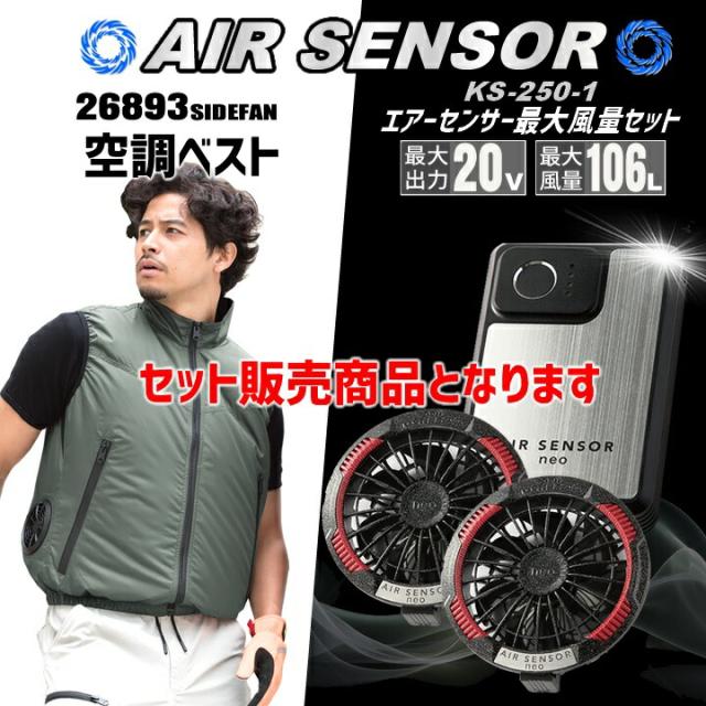 【即日発送】空調ウェア 2025年 エアーセンサー 空調ウェア サイドファン ベスト 26893 バッテリー&ファンセット クロダルマ KS-250 裏アルミ加工 男女兼用 熱中症対策 撥水加工 アウトドア スポーツ 作業着 作業服 ファン対応作業服