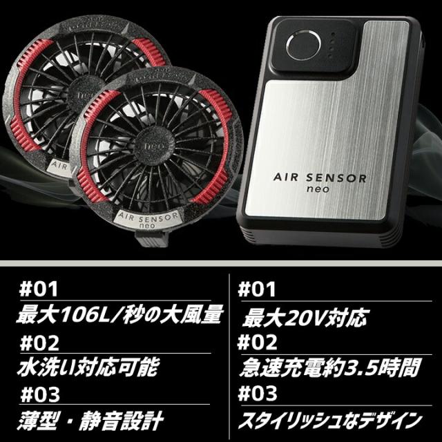 | 説明 特徴 | 【ウェア 特徴】 暑い季節でも快適な着心地の空調ベスト。 遮熱効果の高い裏アルミ加工で着心地快適な空調ウェア。 シンプルデザインで様々なこーでもキマるベストタイプ。 首元には通気口を設置しており風がしっかりと抜け首元・頭も涼しい仕様。 背中部分には保冷剤を収納可能なポケットを搭載し保冷剤を入れれば冷たい風が流れる仕様です。 遮熱性に優れ暑さ対策も万全なエアーセンサーベスト。 【デバイス 特徴】 圧倒的風量と丸洗い可能なファンで簡単お手入れのエアセンサーシリーズ。 20V×106Lの特大風量設計で暑い夏を乗り切れる空調デバイスセット。 最大風量106L/秒の特大風量仕様で暑い季節を突き抜ける設計。 防水栓が付属でついており装着すればファン丸洗い可能です。 汚れたりやお手入れが容易になりいつでも快適に使用可能。 専用充電器を使用すれば約3.5時間の急速充電でノーストレス。 最強モード20Vで最大約8時間稼働・弱モード10Vだと約20時間のパワフル設計。 安定のエアセンサーで暑い季節を乗り切るバッテリー&ファンセットです。 【ウェア 特徴】 ● 風が抜け使い勝手の良いサイドファン仕様 ● 裏アルミ加工の遮熱効果 ● 首元通気口で風が流れる仕様 ● 背中部分に保冷剤収納可能ポケット付き ● 裾ゴム仕様で風が抜けにくい設計 【デバイス 特徴】 ● 20V×106L/秒 の大風量 ● 最強モード20Vで最大8時間稼働 ● 弱モード10Vで最大20時間稼働 ● 防水栓使用で丸洗い可能ファン ● 急速充電約3.5時間 |