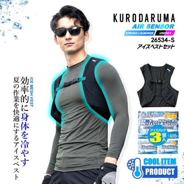 【即日発送】アイスベスト フルセット【ベスト+強力保冷剤】26534S エアーセンサー 保冷剤3個 メッシュベスト 通気性 ストレッチ 保冷剤ポケット 空調服 冷却効果 春夏 熱中症対策 屋外 アウトドア クーラーボックス 警備 移動 作業服 作業着 クロダルマ