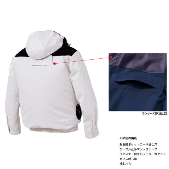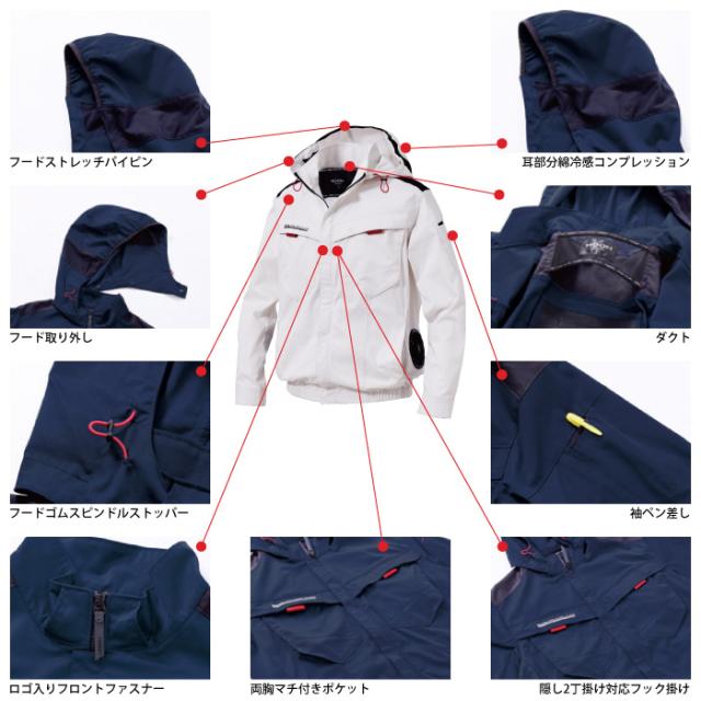◇機能:ロゴ入りフロントファスナー・両胸マチ付きポケット・フードストレッチパイピン・袖ペン差し・耳部分綿冷感コンプレッション・ダクト・ランヤード取り出し口・フード取り外し・ケーブル止めマジックテープ・左右胸ポケットコード通し穴・ファスナー付きバッテリーポケット