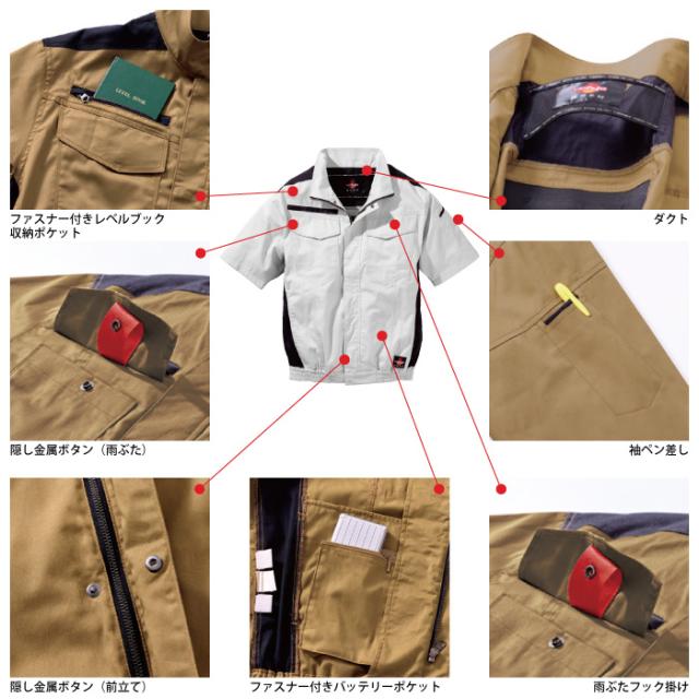 ◇機能:ファスナー付きレベルブック収納ポケット・隠し金属釦・ファスナー付きバッテリーポケット・ケーブル止めマジックテープ・ダクト・袖ペン差し・雨ぶたフック掛け・左右胸ポケットコード通し穴