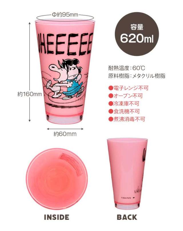 スヌーピーのデザインがカワイイ♪アクリル樹脂製で軽くて丈夫なアクリルタンブラー。落としても割れにくいため、お子様が使う時も安心です◎たっぷり620ml入る大きめサイズで、飲み物だけでなくポップコーンなどお菓子を入れるのにも使えます。他にもペン立てや洗面所用などいろんなシーンで使えます。