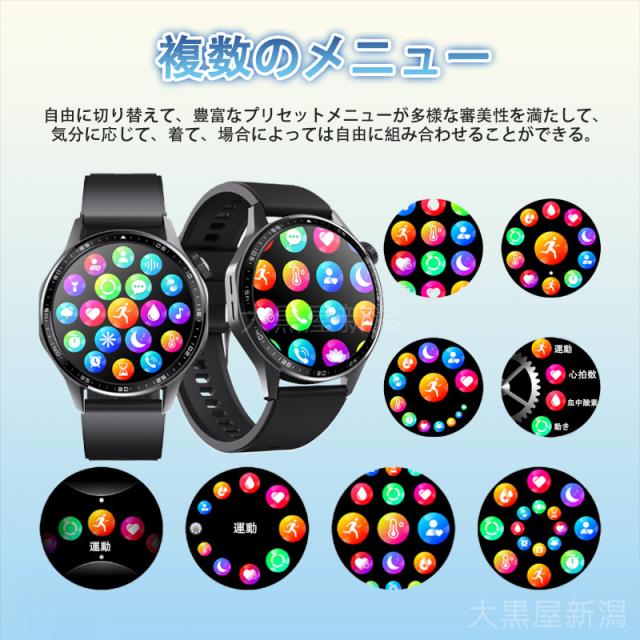 【1.55インチHD大画面・なめらかな操作性】解像度360*360ビクセルの1.55インチ高解像度大画面を使用して、画質は繊細でクリア、色は明るく、視野はより自然です。弊社のスマートウォッチは、独自OSを採用することで充実な機能やスムーズな操作感を叶えているのが魅力です。着信通話・Line/SMS/Twitterメッセージ・アプリ通知など、全て手元でお知らせします。さらに、スマートウォッチには、iPhoneとAndroidスマートフォンのどちらでも接続できるというメリットがあります。活動量計などを記録するモニタリング機能も充実しており、日々の運動習慣管理に役立つスマートウォッチが欲しい人におすすめです。腕上げ点灯機能を搭載しているので、時間と歩数データなども適宜知ることができました。同時に、アプリから個性豊かな文字盤の変更も、その日の気分に合わせてスマートフォンからワンタッチで操作できました。