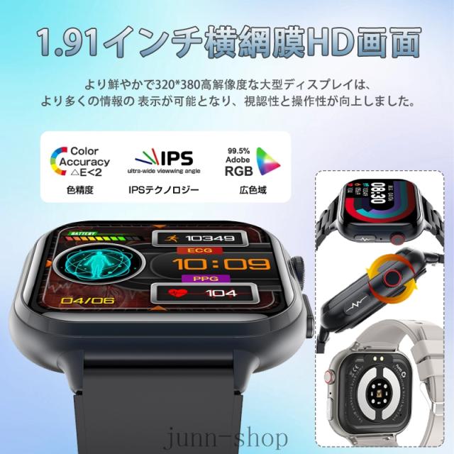 【DIY文字盤&多機能を搭載】- スマートウォッチの文字盤は固定ではありません。多くの文字盤から選べるだけではなく、お好みによって自分が好きな写真を文字盤に設定できます。 320* 380の高解像度と1.91インチのフルタッチスクリーンで、細かい文字でもはっきりと表示されます。他にも音楽コントロール、携帯を探す、腕上げ点灯、タイマー、ストップウォッチ、データ同期、女性生理管理など便利な機能を備えているので、男性でも女性でも使いやすいです!!生活、仕事の効率をさらに上げ、日常生活もより便利にしてくれます。