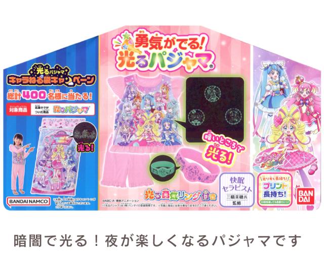 暗い部屋では、プリキュア達が光ります!お着替えを嫌がったりまだ寝たくないお子様、電気を消すのや一人で寝るのが苦手なお子様のおやすみを応援するパジャマです。