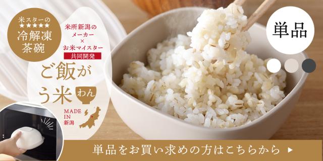 「ご飯がう米わん」は、ホ米処新潟の企業とお米マイスターが生み出した冷凍できるお茶碗。電子レンジで加熱する際に容器を逆さまにすることで、内部のスノコが余分な水分を落とし、蒸気でご飯をふっくらと仕上げます 。