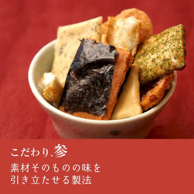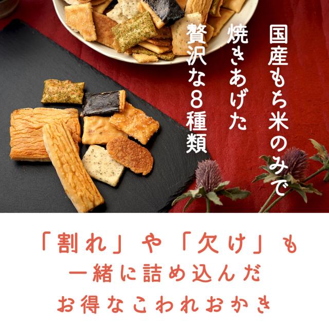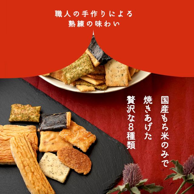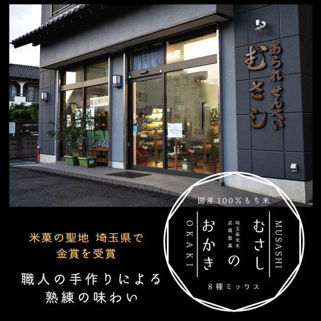 埼玉県北本に店を構え八十余年、むさしのおかきは国産もち米に秘伝の特製ブレンド醤油を使用して生まれる極みの逸品。添加物等は一切使用せず国産米のみを使用し、生地の乾燥も機械ではなく自然乾燥で行う代々受け継がれる製法を守り続けています。素材の味がしっかり味わえるおかきを造りたい。味付けも醤油と砂糖と最低限。機械を使わずに自然乾燥でじっくりと手間暇をかける初代から受け継がれる製法を守り続けています。職人のこだわりが詰まった8種類のおかきを1袋にミックスしました。