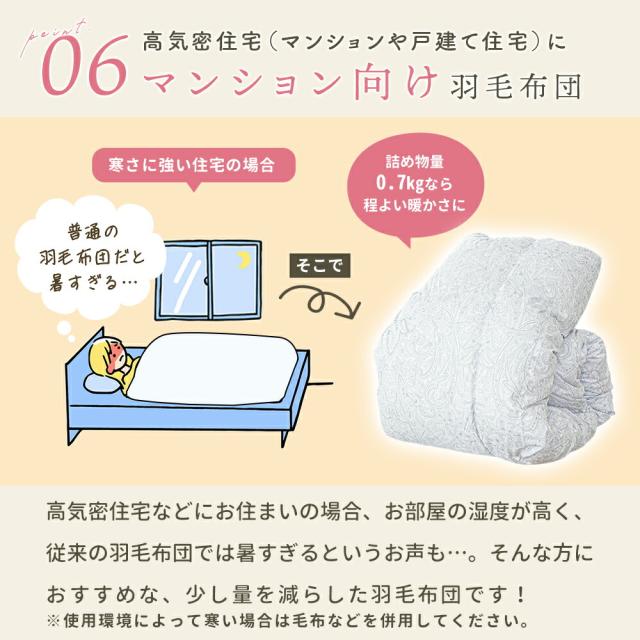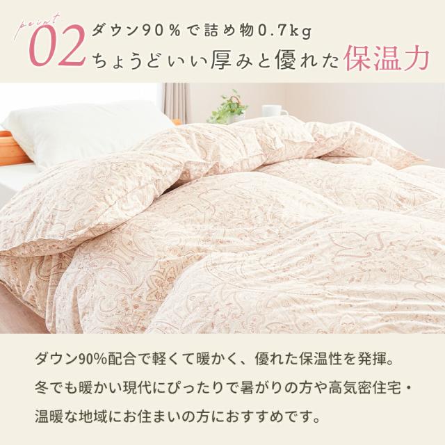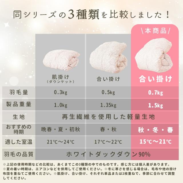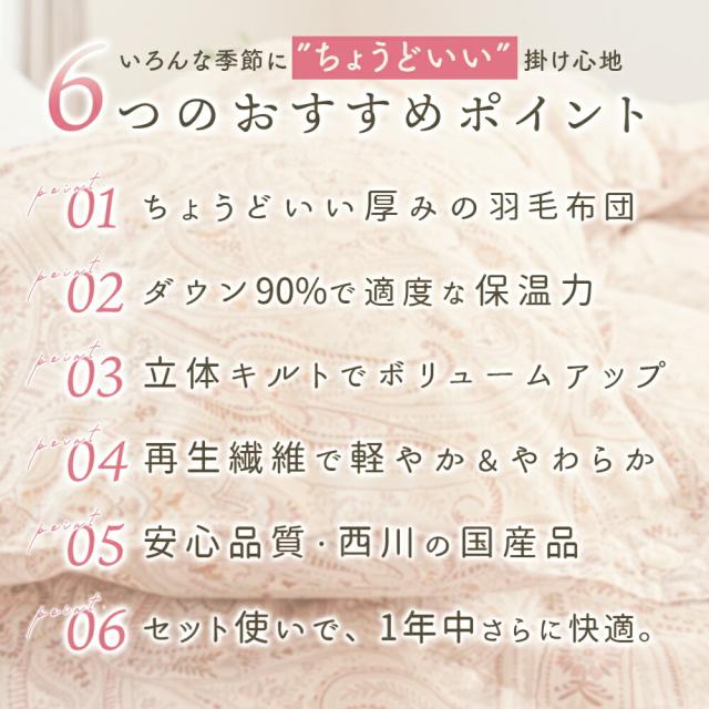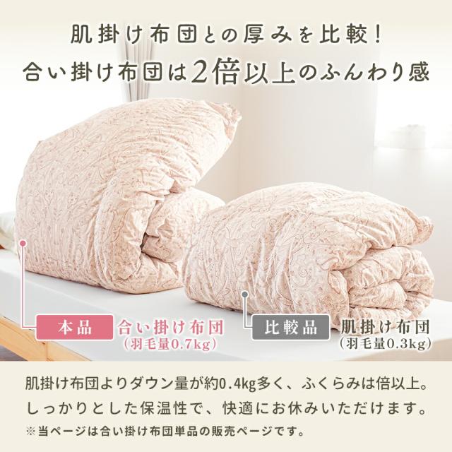 | おすすめポイント | ・こんな厚みが欲しかった…。中厚タイプの”ちょうどいい”羽毛布団 秋?初冬や、晩冬?春のおふとん選びが難しい時期に適した合い掛けタイプ。肌掛けでは物足りないけど、冬掛けでは暑すぎる…。そんな季節の変わり目にもぴったりな一枚です! ・ダウン90%で詰め物量0.7kg。ちょうどいい厚みと優れた保温力ダウン90%配合で軽くて暖かく、優れた保温性を発揮。冬でも暖かくなってきた現代にぴったりで、暑がりの方や高気密住宅・温暖な地域にお住まいの方にも最適。 ・暖かさを逃がさない作り。立体キルトでボリュームアップ羽毛の持つふくらむ力を存分に発揮するため、羽毛の小部屋を立体的につくったキルトです。平面キルトの縫い目部分の無駄をなくし、暖かさを逃がしません。 ・環境に配慮した再生繊維生地。軽やか&柔らかさをプラス軽くて柔らかな再生繊維(リヨセル)に、丈夫なポリエステルを配合し、さらなる耐久性をプラスしました。優れた吸湿性と通気性を兼ね備えました。 ・安心安全の高品質な国内品、老舗メーカー・西川製品品汁にこだわりたい方も安心。日本有数の寝具メーカー「西川」の製品です。長い歴史の中で、積み重ねられたその技術は、高い品質と信頼があります。 ・高気密住宅(マンションや戸建て住宅)にマンション向け羽毛布団高気密住宅などにお住まいの場合、お部屋の湿度が高く、従来の羽毛布団では暑すぎるというお声も…。そんな方におすすめな、少し量を減らした羽毛布団です! 合い掛け布団と肌掛け布団を重ねることで、贅沢ボリュームに!寒い冬でも使える2枚合わせの掛け布団に変身し、1年中快適さが続き、長くお使いいただけます。 | |