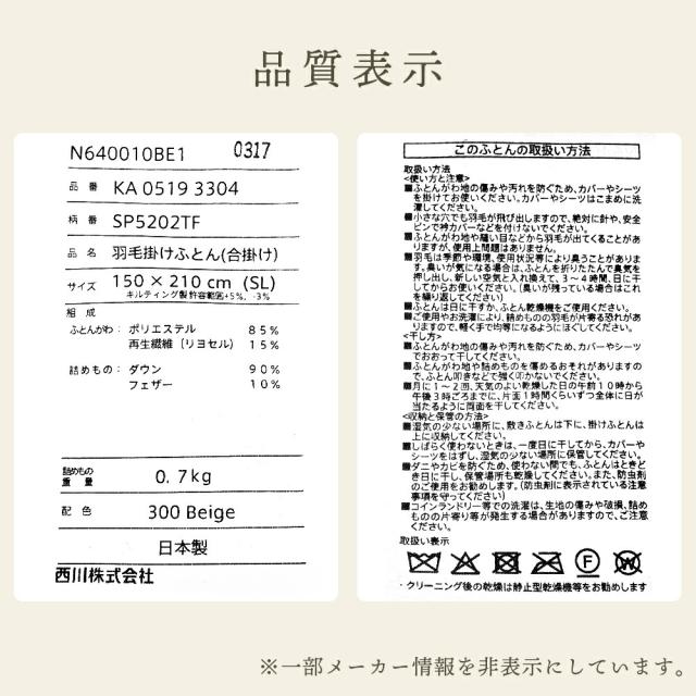 [keyword|当社限定 西川 羽毛合掛け布団 シングル ホワイトダウン90% 0.7kg 春 秋 ホワイトダック ダックダウン 150×210cm グレー ベージュ 寝冷え対策 合掛け 羽毛布団 羽毛ふとん 日本製 国産 オールシーズン 安眠工房]