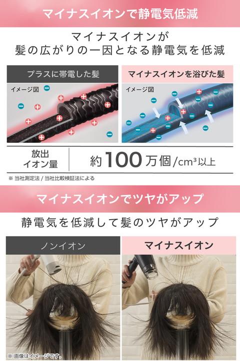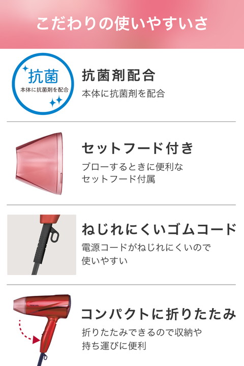 大風量1.7m3/分※ 軽量タイプで、らくらく時短ドライ。※スイッチポジションTURBO使用時![]() ■忙しい朝も便利な大風量タイプ。毎日のドライがスピーディーに。※スイッチポジションTURBO使用時 軽量タイプだから、毎日使いでも疲れにくく、らくらく使えます。ファミリーユースにぴったり。 ■吹出口の2ヶ所からマイナスイオンを発生させ、風に乗せて放出することで、マイナスイオンを髪の根元までしっかり行き渡らせます。髪の広がりの一因である静電気を低減し、髪のツヤもアップします。※イメージ図 ■抗菌剤を配合しているので、清潔に使えます。 ■[TURBO-SET-COOL]の3段階切り替え。髪をセットした後に冷風を当てるとセットが長持ちします。 ■ブロー時に便利なセットフードが付属します。 ■電源コードがねじれにくいので、使いやすく保管もきれいにできます。 ![]() ■サイズ:高さ / 204 mm 幅 / 158 mm 奥行き / 83 mm (本体のみ)、高さ / 204 mm 幅 / 199 mm 奥行き / 83 mm (フード付き) ■質量:420g(本体のみ)、435g(フード付) ■消費電力:1200W ■付属品:セットフード ■電源:AC100V 50/60Hz ■スイッチ:TURBO-SET-COOL-OFF ■折りたたみ:○ ■マイナスイオン発生吹出口:ダブルマイナスイオン(マイナスイオン2ヵ所吹き出し) ■温風温度:85℃(TURBO時、フード無し。周囲温度30℃の場合) ■風量(m3/分):1.7m3/分(TURBO時) ■搭載イオン:マイナスイオン ■ラク抜きプラグ:× ■カラー:ピンク ■コード長:1.7m ■パーツ:セットフード(501362) ■保証期間:1年間 |