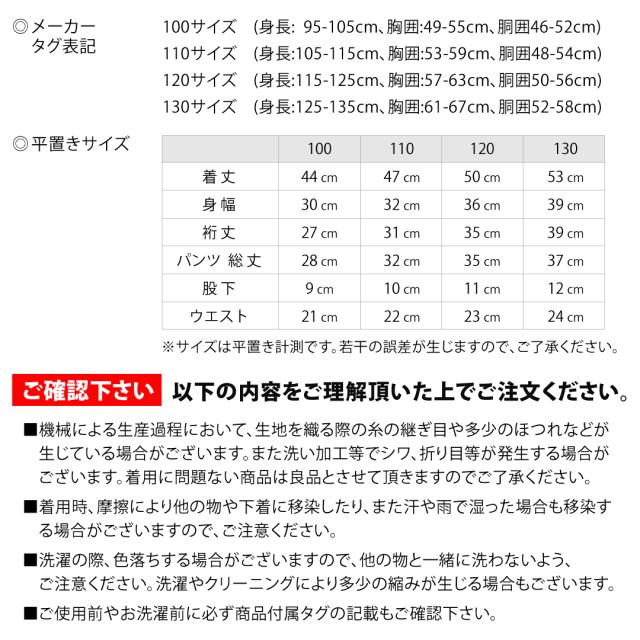 | サイズ | 100サイズ (身長: 95-105cm、胸囲:49-55cm、胴囲46-52cm) 110サイズ (身長:105-115cm、胸囲:53-59cm、胴囲48-54cm) 120サイズ (身長:115-125cm、胸囲:57-63cm、胴囲50-56cm) 130サイズ (身長:125-135cm、胸囲:61-67cm、胴囲52-58cm) |