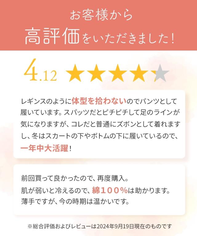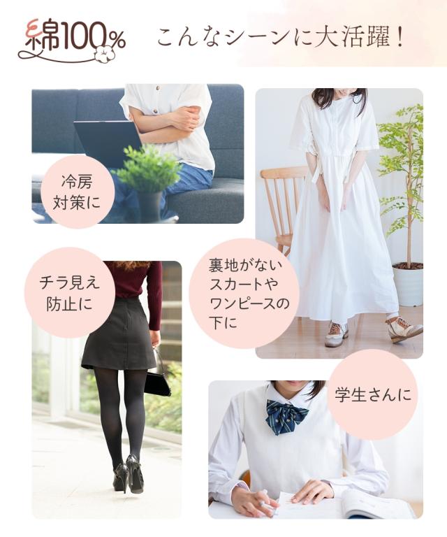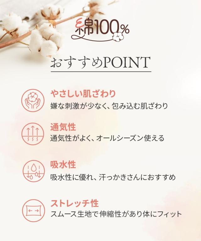綿100%スムースゆったり10分丈レギンス ムレにくく、やさしい肌ざわり 【ニッセンの綿100%シリーズ】 素肌に着るインナーは、心地いい素材にこだわりたい。 肌にやさしい天然綿100%でオールシーズン使える丈夫な素材。 ◇◇◇おすすめPOINT◇◇◇ 【やさしい肌ざわり】 嫌な刺激が少なく、包みこむ肌ざわり 素肌に直接触れるものだから、肌ざわりにこだわりました。 【通気性】 通気性がよく、オールシーズン使える 綿は通気性に優れ、吸湿性もあるので、さらりとした快適な着心地 【吸水性】 吸水性に優れ、汗っかきさんにおすすめ 汗などの水分をしっかり吸収してくれる綿素材は 肌着・下着などのインナーに最適 【ストレッチ性】 スムース生地で伸縮性があり身体にフィット 若干厚みがあり柔らかい生地は普段使いにちょうどいい 【細部にもこだわった仕様】 股上深めなので、かがんでも背中が見えにくい! 98%以上の紫外線を防ぐので、履くだけで日焼け対策にも! ウエストゴムはねじれ防止縫製になっています。 【チクチクしないプリントネーム】 プリントネームなのでチクチク感が気にならず、快適な着心地 こんなお悩みありませんか 「汗をかくと内ももが赤くなる」 「歩くたび