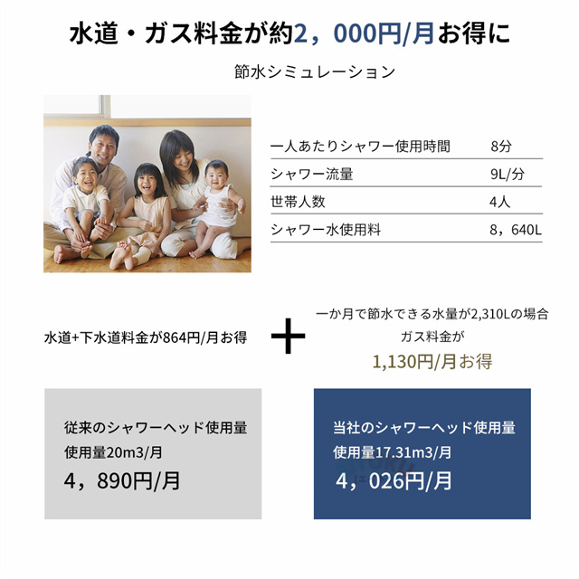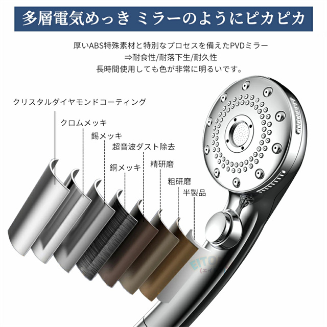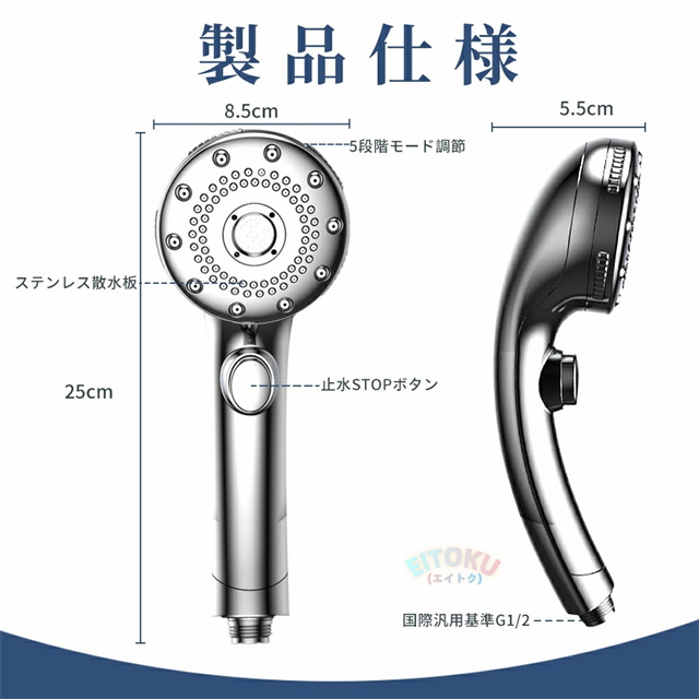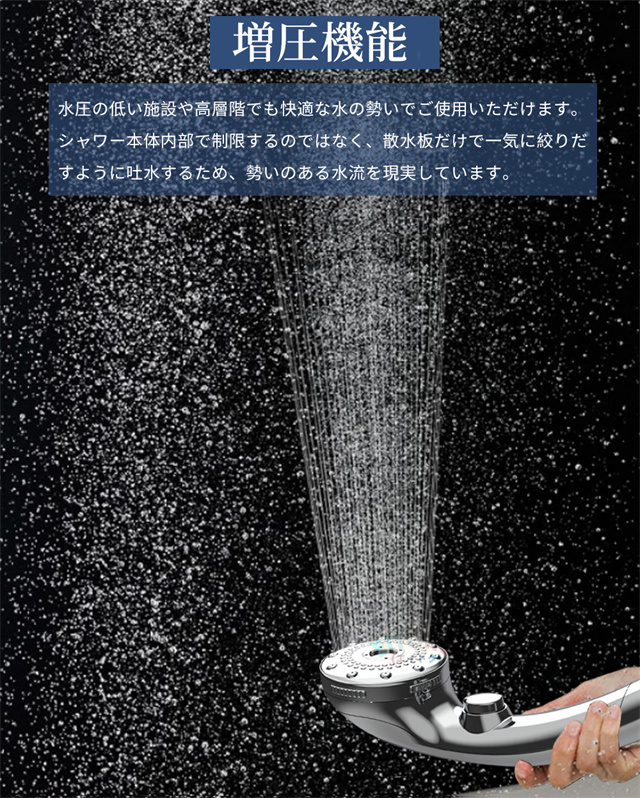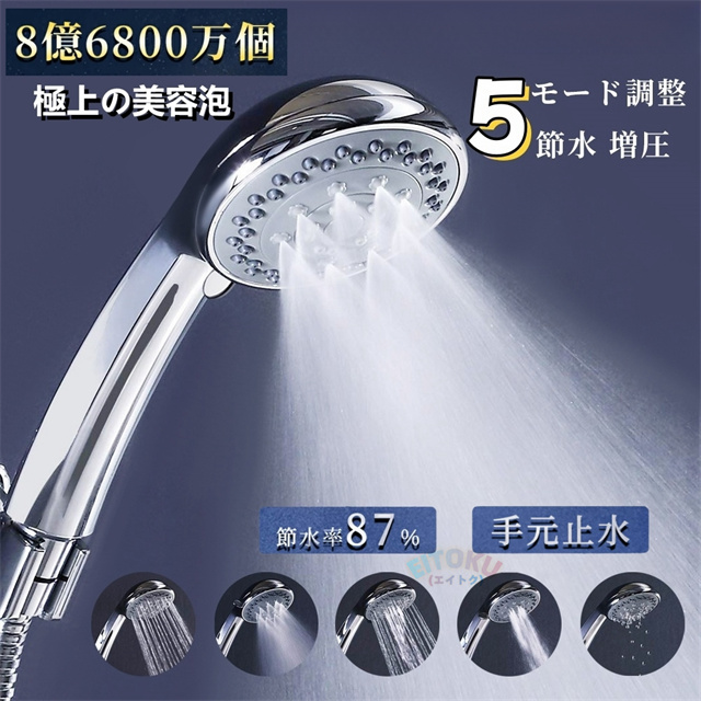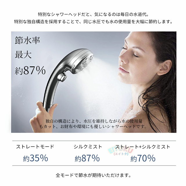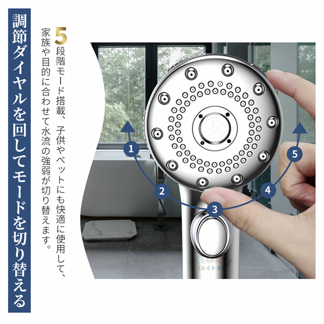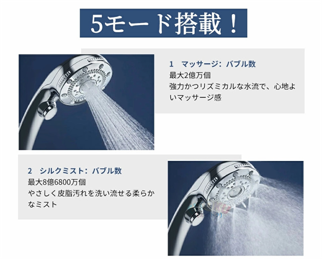 ストレートモード、シルクミストモード、ストレート+シルクミスト、ストレート+マッサージ、マッサージなど5階段モードが調整可能、ニーズに応じてモードを選ぶことができます!さらに止水機能が付き、いつでもストップできます。また、抜群な増圧効果により、 少量の水でも勢いのある水流に供給し、水の使用量を大幅に節約します。水道代だけでなく、湯沸かしで給湯器にかかるガス代や電気代等節約になります。 |