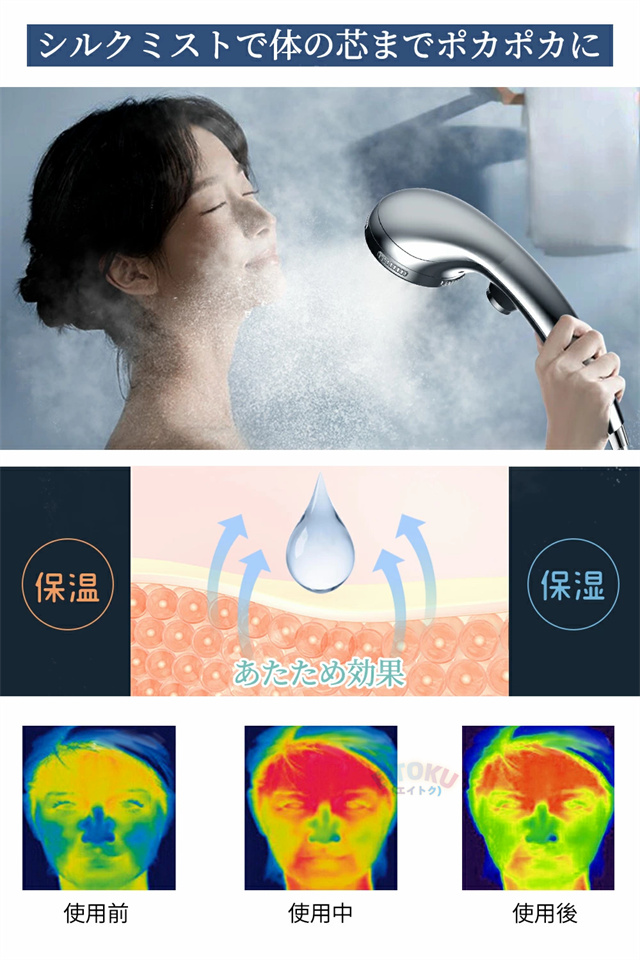 ヘッドのダイヤルを回して簡単に水流を切り替えできます。 毛穴の黒ずみや皮脂汚れを取り除きワントーン明るい肌へ導きます。また、高い保湿力で しっとり潤い肌でお風呂上りも湯冷めしにくい効果が期待できます。温ミストモードで毛穴の奥で弾ける美泡で身体の芯までぽかぽかに |