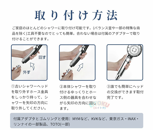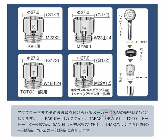 国際汎用基準G1/2インターフェースで、工具不要でわずか3秒でシャワーヘッド本体にシャワーホースを簡単に取り付けることが可能です。M/K/G/Tの4種類のジョイント付き、自宅のシャワーヘッド規格によって簡単に取付けられます。 そのまま取付可能:TOTO(一部)用・SANーEI・INAX・KAKUDAI・LIXIL、東京ガス(ご注意:最新型のシャワーヘッドなので、一部分のTOTO製(旧製品)を対応できない可能性があります。)付属アダプターで取付可能:KVK・MYM・ガスター、東京ガス・INAX・リンナイの一部製品、TOTO(一部) |