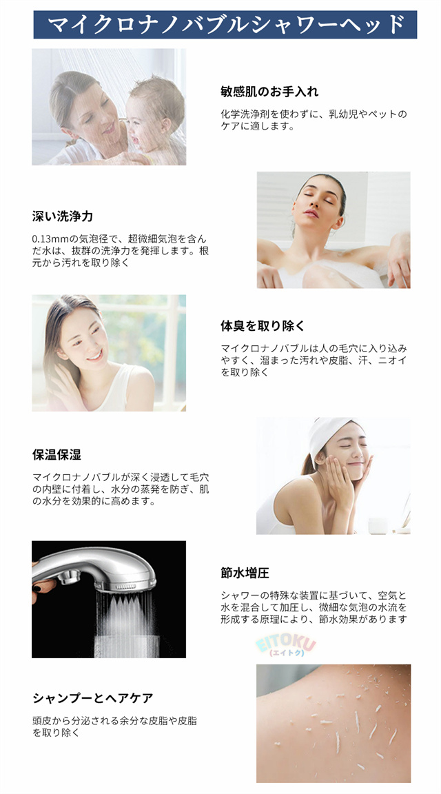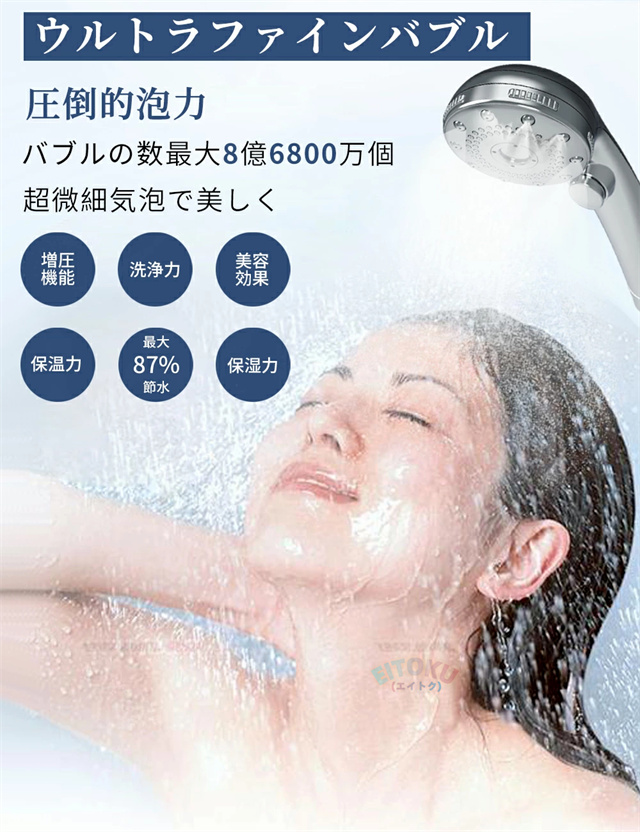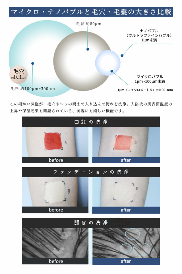 圧倒的なバブル数最大8億6800万個の泡数で洗浄と保湿を叶え、高濃度マイクロバブルという超微細の気泡を作れるもので、洗浄力がよく、落ちなかった体の汚れや頭皮の油脂分を毛穴まで入り込み吸着し、やさしく洗い流してくれます。肌の水分を高くキープできるといった魅力があります。より微細な気泡を作り、洗い心地がよく、毎日のお風呂をもっと快適にバスタイムで一日の疲れを愈す。 |