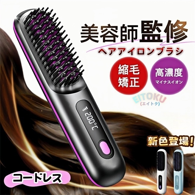 《新色登場!》ヘアアイロン ヒートブラシ くし型 ストレートアイロン ミニブラシ マイナスイオン コードレス カールアイロン 携帯 小型 軽量 美髪 縮毛矯正 ブラシアイロン MAX200℃ 急速加熱 充電式 男女兼用 温度表示 やけど防止 家庭 旅行