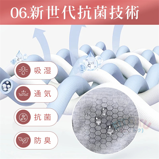 【新世代抗菌技術】抗菌3層構造が嫌な菌を99%抑制!通気性が高く抗菌・消臭に優れた注目の新素材・グラフェン素材を採用。六角形格子状のテクスチヤが水分をすばやく吸収・拡散して<れます。