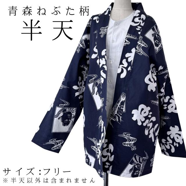 青森ねぶた祭柄 着物半天 柄:太字 紺 サイズ:フリー<はんてん はっぴ 法被 半被 半纏 半被カーディガン 羽織 上着 あおもり >
