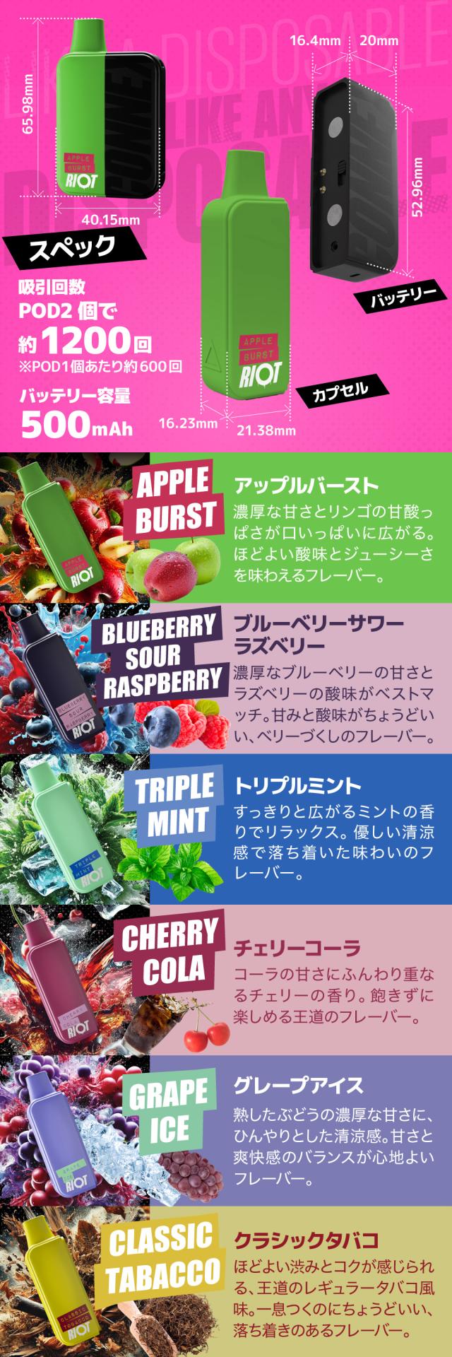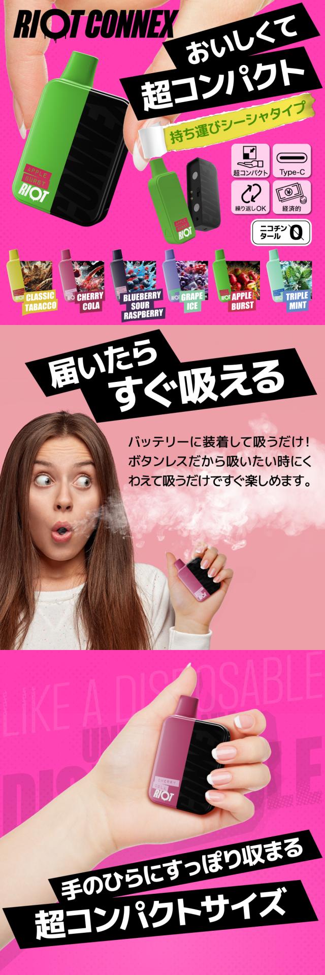 RIOT CONNEXは、コンパクトで手になじむデザインと、気分に合わせて選べる個性豊かなフレーバーが特徴です。