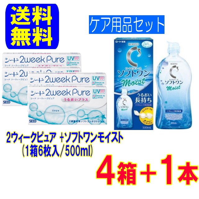 2ウィークピュア うるおいプラス【4箱】+ソフトワンモイスト500ml【1本】送料無料 2週間使い捨て シード コンタクト ケア用品 2week 2ウィーク★