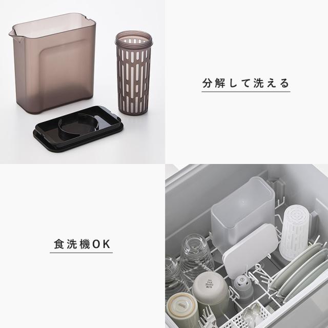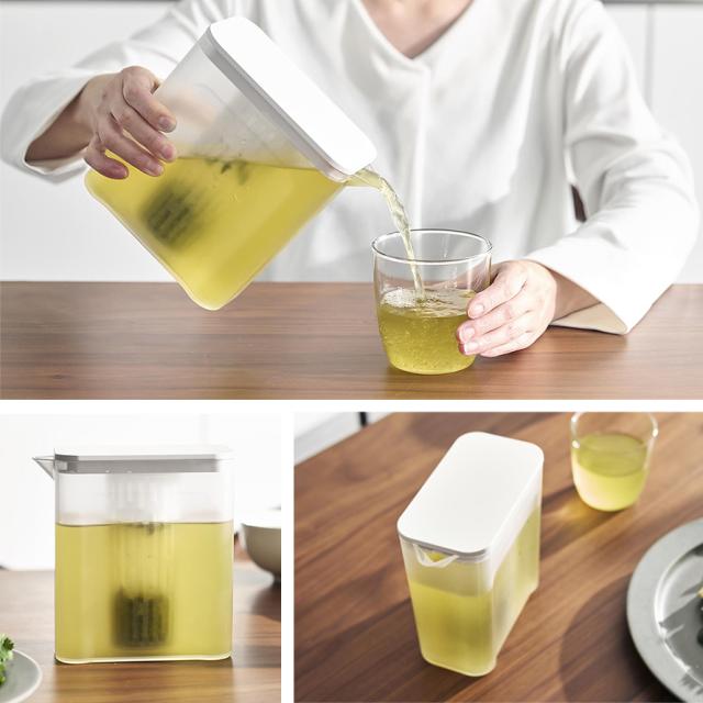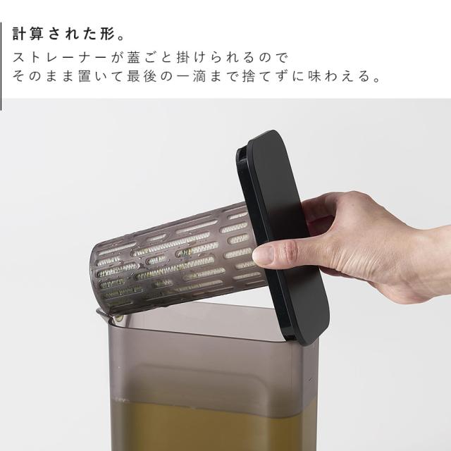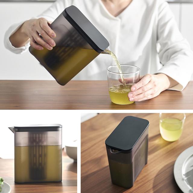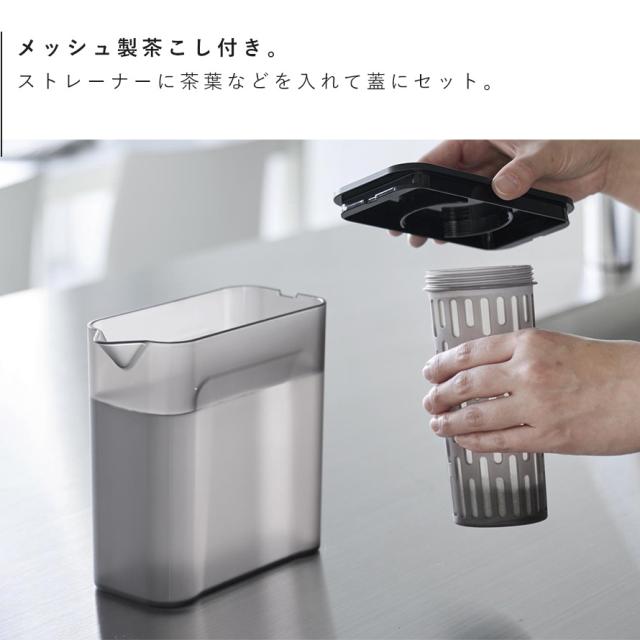 冷蔵庫の下段に収まるサイズで、茶葉をそのまま入れられるメッシュ製フィルター付きの冷水筒(1L)です。茶葉やお出汁を水出しする際、フィルターが底まで届くので少量の水でも抽出することができます。