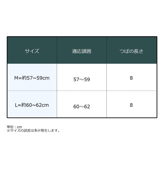 材質=綿100% サイズ=M:適応頭囲約57〜59cm(内側面テープで調整可) L:適応頭囲約60〜62cm(内側面テープで調整可) つばの長さ=約8cm UVカット率99%以上 原産国:中国製 備考:手洗い 単位:cm ※サイズの誤差は多少発生します。