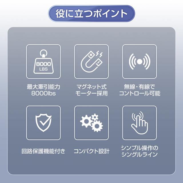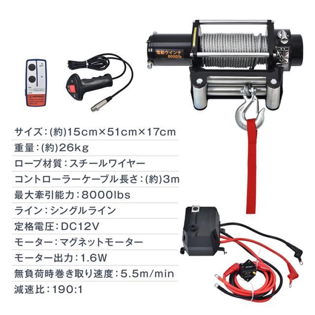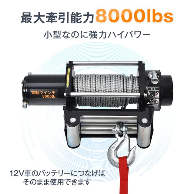 電動ウインチ 12V 8000LBS ワイヤータイプ 無線リモコン付 ウインチ 電動ホイスト DC12V 防水仕様 サーキットブレーカー付き