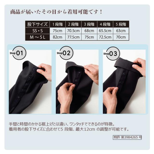 | 説明 特徴 | ワンタッチ操作ですぐに裾上げ、すぐに着用できる「裾上げらくらくパンツ」にチノパンが登場。 着用者の股下サイズに合わせて5段階、最大12cmの調整が可能(特許:No3984265)。 ウエスト両脇は脇ゴム仕様になっていて動きやすくはき心地も快適。 シンプルデザインで幅広いウェアと好相性です。 どんなアイテムとも好相性で活躍の幅も広がります。 |