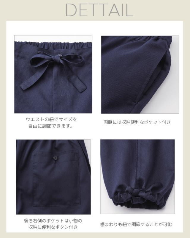 | 仕様 | 両脇シームポケット ウエストゴム入り紐付き 後ろ右側アウトポケット 裾紐付き 吸水 速乾 |