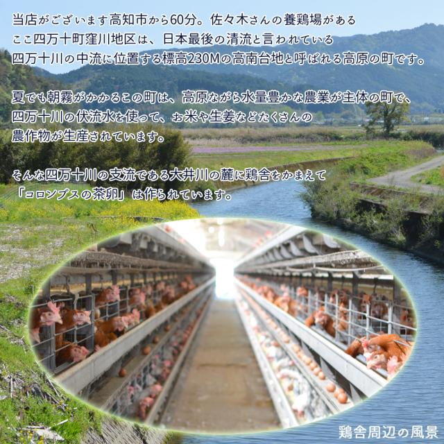 そんな四万十川の支流である大井川の麓に鶏舎をかまえて「コロンブスの茶卵」は作られています。山の傾斜に立つ養鶏場には夏でも絶えず四万十川からの涼風が感じられる恵まれた環境ですが、暑さに弱い鶏ですので、真夏の暑い折にはミストを噴霧して室温を下げるなどの対策も行っています。